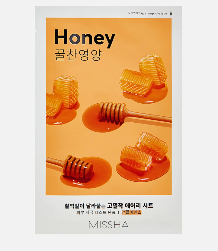 Одноразовая тканевая маска MISSHA Airy Fit Sheet Mask Honey с экстрактом мёда интенсивно увлажняет, питает и смягчает огрубевшую, сухую и обезвоженную кожу лица. Маска пропитана водной эссенцией ампульного типа. Благодаря богатейшему составу сахаров, фруктовых и органических и аминокислот, витаминов группы B, C и микроэлементов экстракт мёда напитывает кожу, стимулируя обменные процессы в клетках и запуская регенерацию тканей. Является мощным антиоксидантом, замедляет увядание и уменьшает признаки возрастных изменений кожи. Вспомогательные увлажняющие компоненты и растительные экстракты дополняют список уходовых свойств тканевой маски Missha.